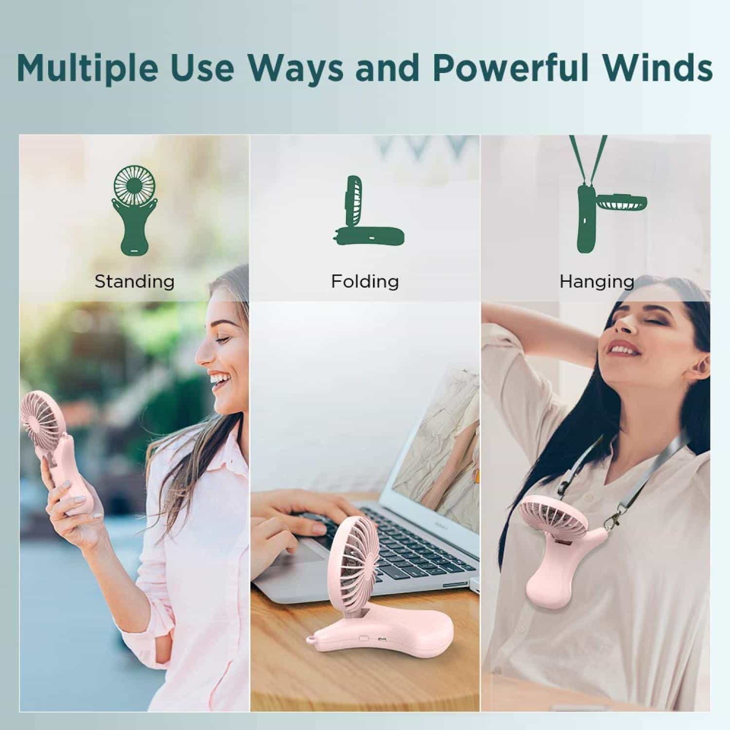 Made of ABS and PC. Portable handheld fan neck fan with built-in 2000 mAh large-capacity battery. Adjust the fan by 100¡ã up or down based on your height or positioning. 3-in-1necklace fan, can be used as a handheld, wearable, or desk fan, satisfying all your cooling needs during summer. This small fan is great for amusement parks, sporting events, outdoor concerts, walks in the park, wandering, travelling, hiking, backpacking, picnics, and more. Complies with Prop 65. 3.7″ L x 1″ W x 7.2″ H
