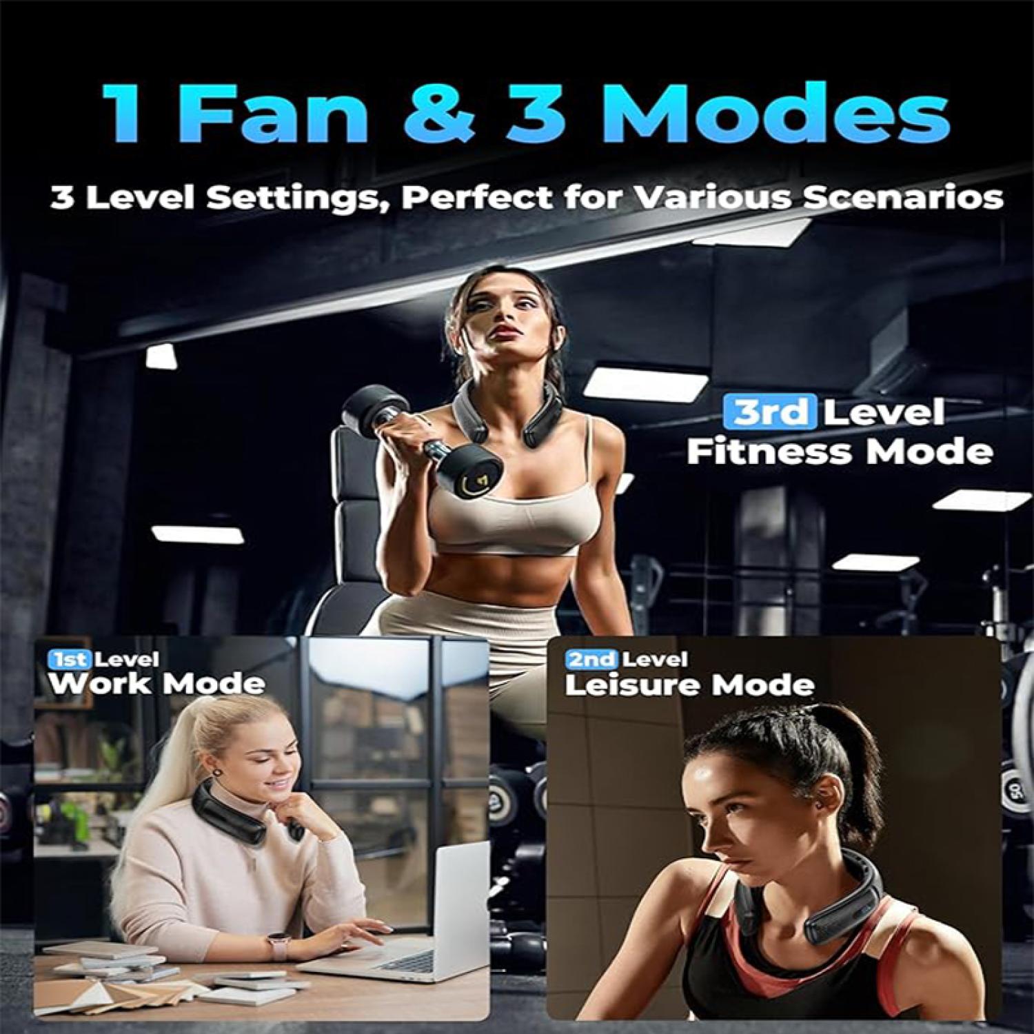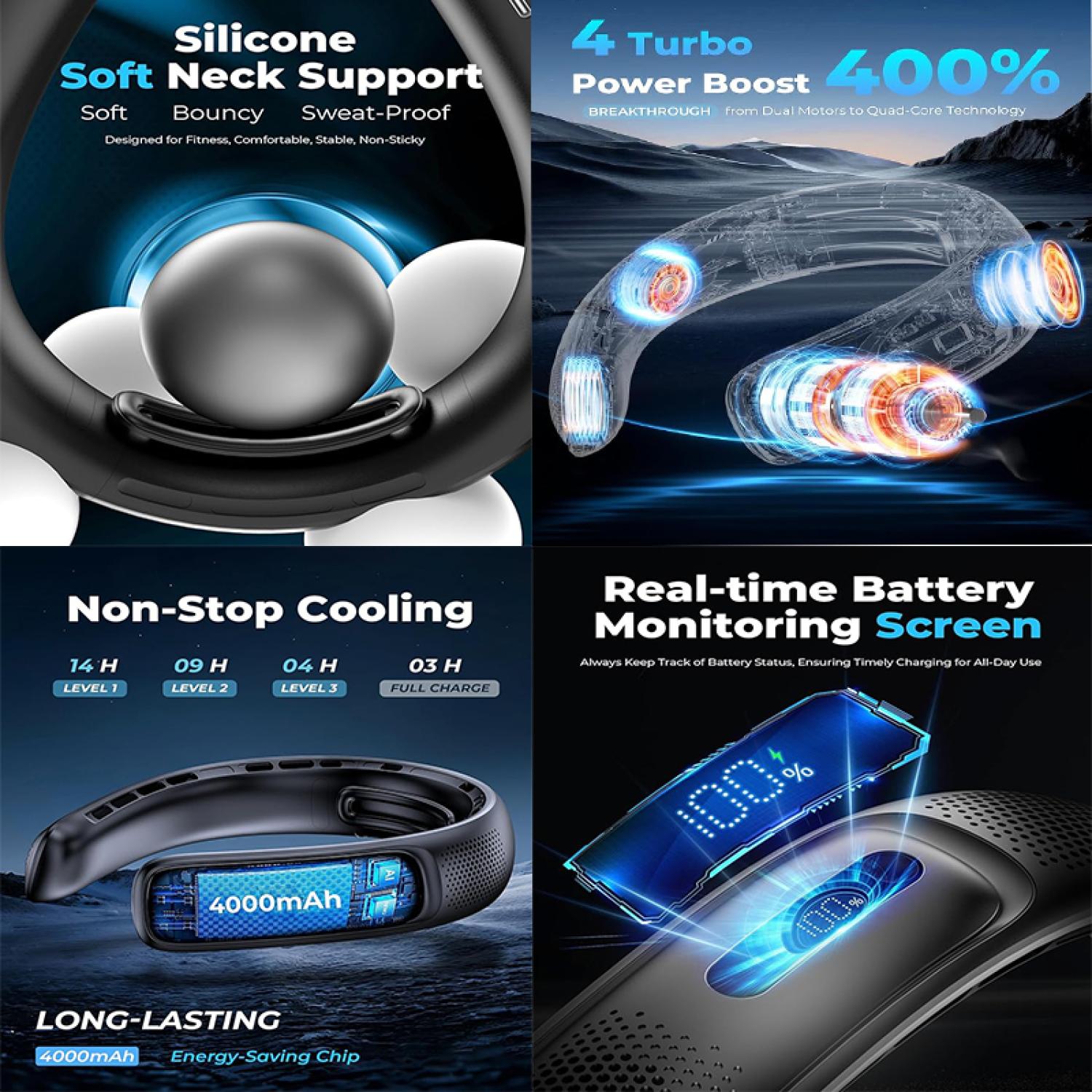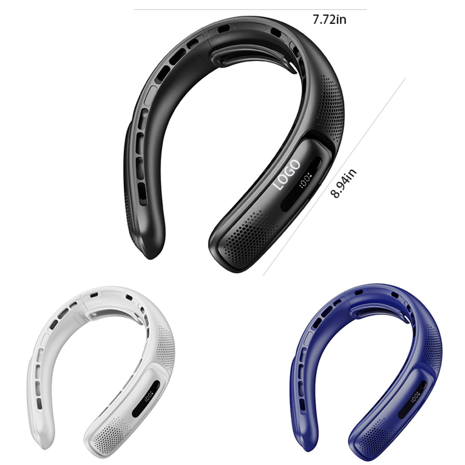 Combining four motors and 16 air outlets, it brings a super cool experience. Equipped with battery level display function, real-time monitoring of battery status, and a comfortable and snug neck silicone pad design to reduce long-term wearing pressure. Three levels of wind speed regulation, low level can be used continuously for 8 hours. Foldable design, convenient for storage, suitable for carrying around, suitable for outdoor sports and travel, customized logo to promote the brand. 8.94″ L x 7.72″ W x 1.97″ H