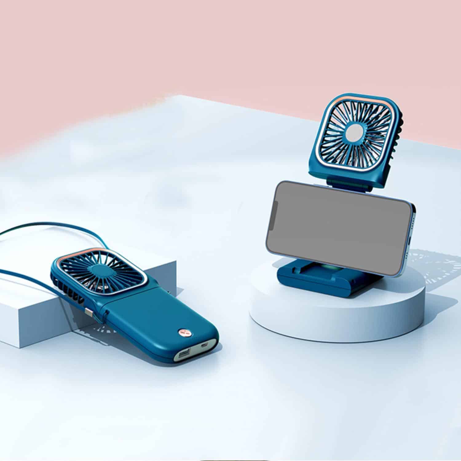 The portable fan can be carried in your pocket or school bag, or it can be worn around your neck on the lanyard. You can also fold and secure the fan to the table, or unfold it to use as a phone holder. Don’t worry about sweat ruining your makeup; the fan includes a 3000 mAh battery that can function as a high-capacity mobile power supply. Complies with Prop 65. 3.2″ L x 0.7″ W x 6.5″ H