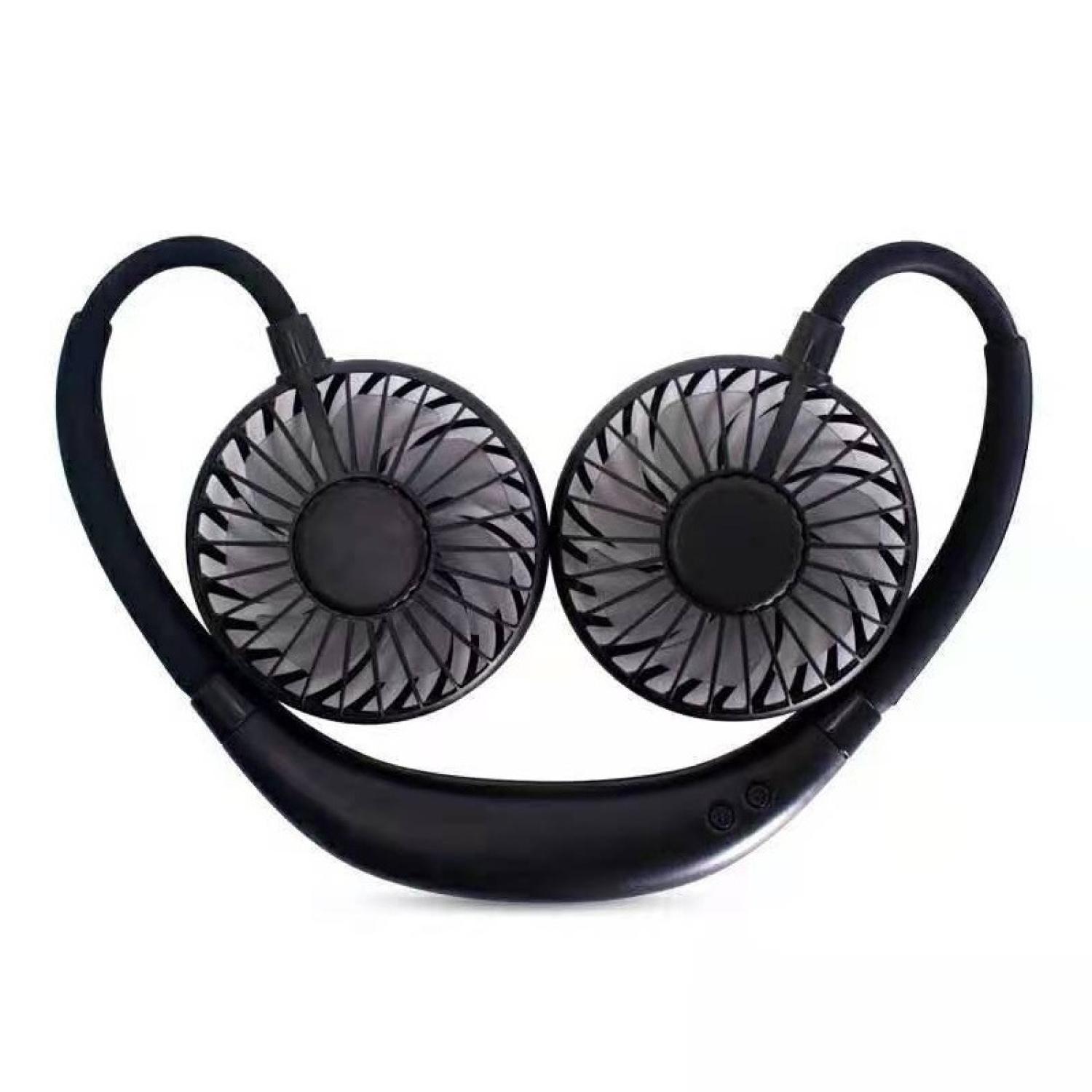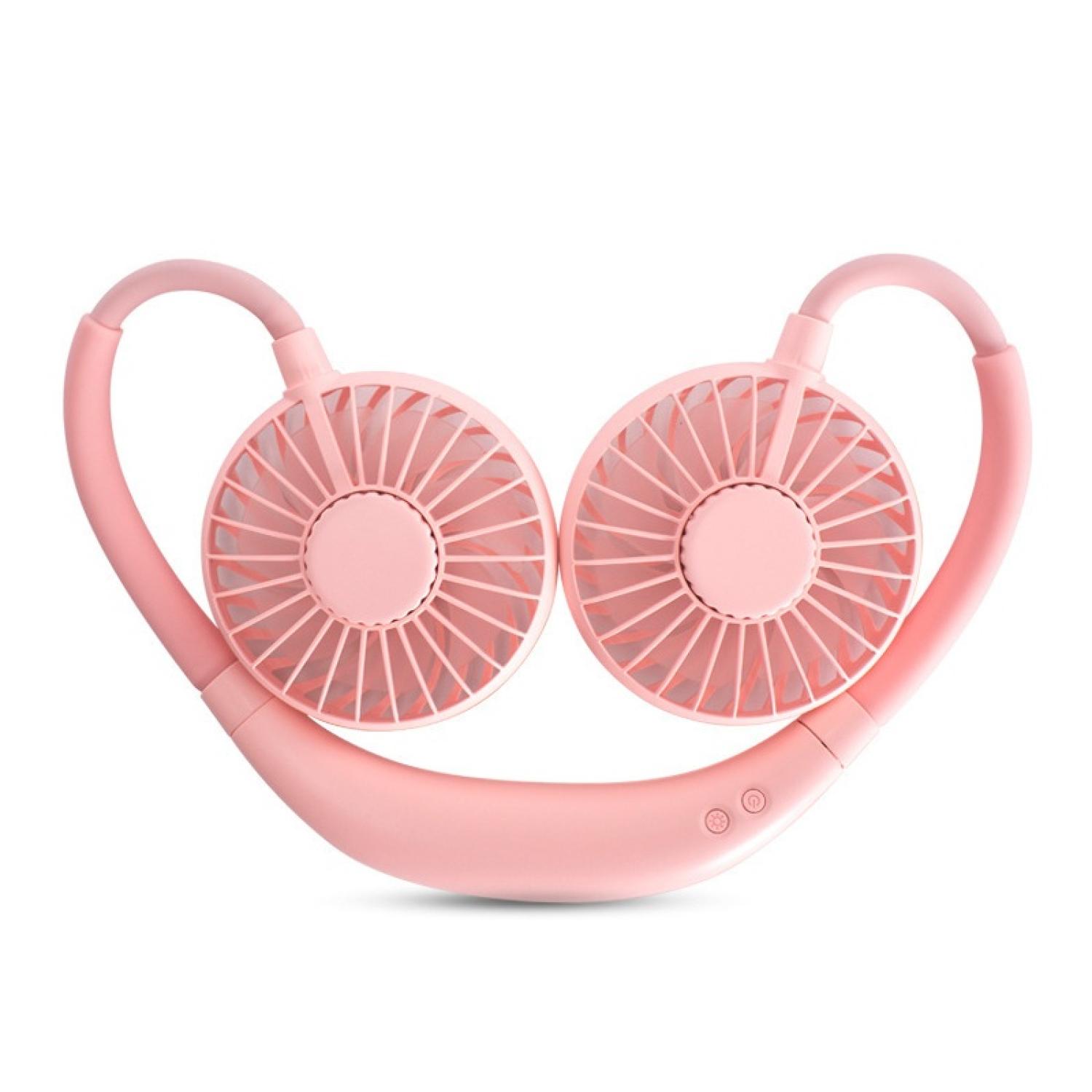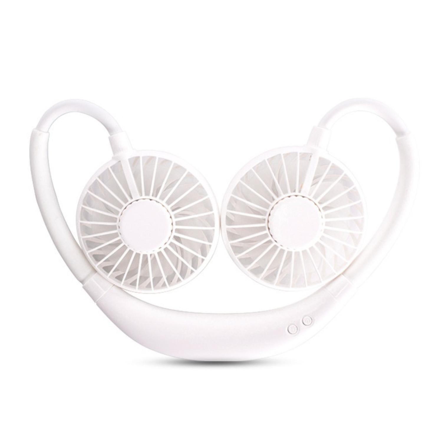 This dual breeze hands-free portable fan is made of durable ABS plastic. Both fan heads have 7 blades and 3 adjustable gear wind speeds and can rotate 360 degrees at your will. On and off button is on the top. Press once for gentle wind, press twice for strong wind, press third time for strongest wind, press fourth time to turn off. The second button controls 2 different light molds: 7-Color changing and White. Runs up to 4 hours on a single charge with rechargeable built-in 1200 mAh battery. And a micro USB charging cable included for easy carry. 12″ L x 7 1/2″ W x 1″ H