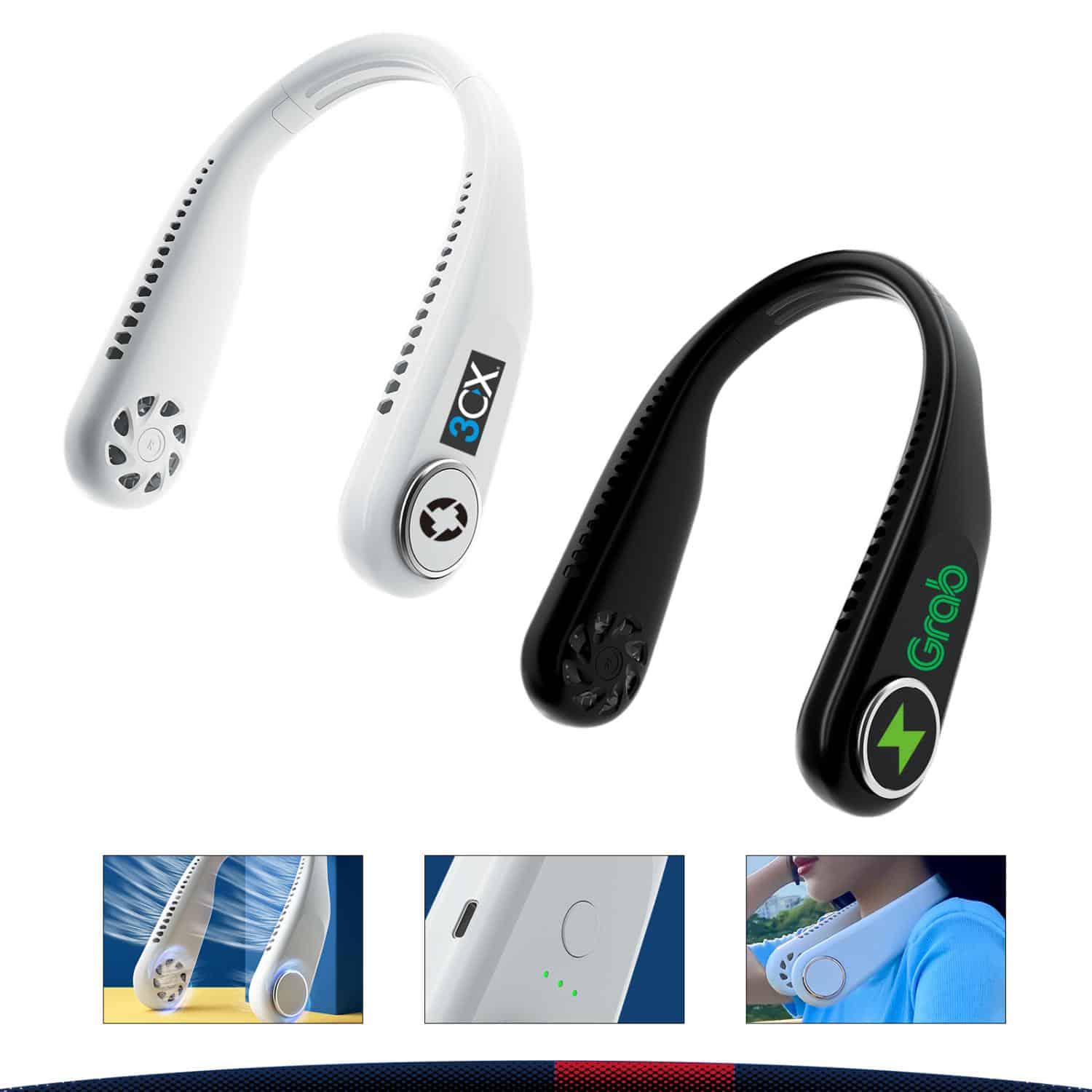 Keep cool and carry on with style and ease! Constructed from high-quality ABS and silicone, Trepa Neck Fan boasts an adjustable design that suitable for individuals of all sizes. Built-in 3600mAh rechargeable battery with a Type-C charging port (charging cable included) for easy charging in 3 hours, and delivers a cool breeze for 2-6 hours on a single charge. Three adjustable speed settings with a single button allows for effortless operation. Blank space for custom logo. 9.06″ H x 5.39″ W x 2.36″ D